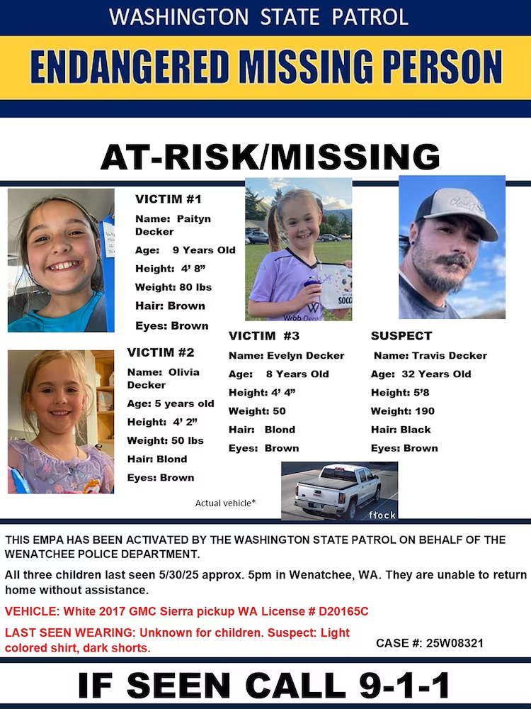 The girls — 9-year-old Paityn Decker, 8-year-old Evelyn Decker and 5-year-old Olivia Decker — were last seen at approximately 5 p.m. on Friday when they left to be with their father, Travis Decker, on a “planned visitation,” police said.