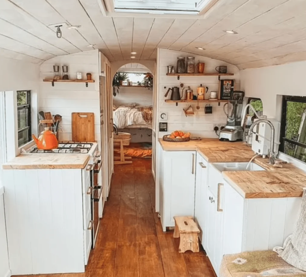 It looks less like a converted bus and more like a tiny house on the beach in the faraway. It has a full-sized bathroom, a cozy bed, and even a small, shiny coffee maker sitting on one of the polished wooden counters.