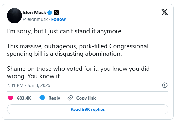 ā€œThis pork-filled spending bill is a disgusting abomination,ā€ Musk wrote on X, June 3. ā€œShame on those who supported it. You know you did wrong.ā€