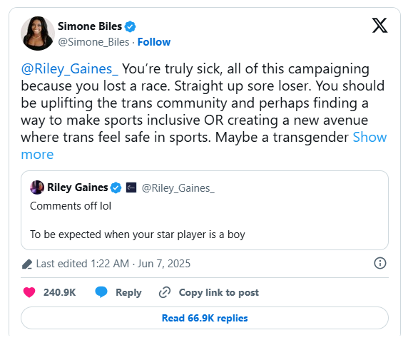 She urged Gaines to support inclusivity in sports and consider working toward a separate category for transgender athletes. Biles also accused Gaines of bullying trans individuals, claiming her actions create an unsafe environment.