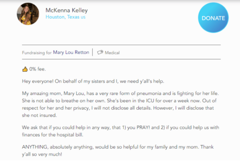 Fundraising post for Mary Lou Retton’s pneumonia, Photo Credit: Spotfund