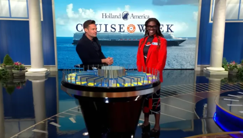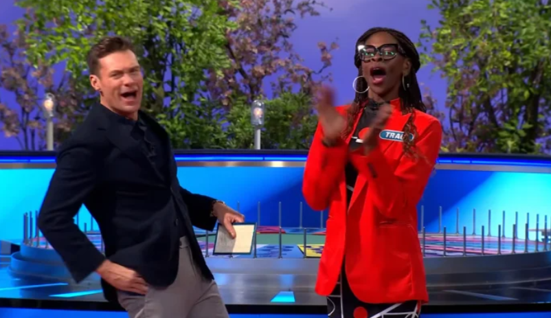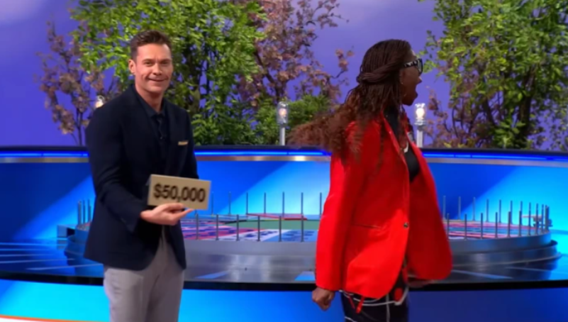 Host Ryan Seacrest standing next to contestant Traci Demus-Gamble, Photo Credit: Wheel of Fortune/Youtube