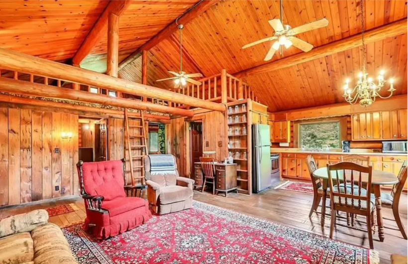 There are cute touches inside the cabin that make it feel like a cozy country home. Wooden ceiling beams and a wooden floor make the room feel more like home.